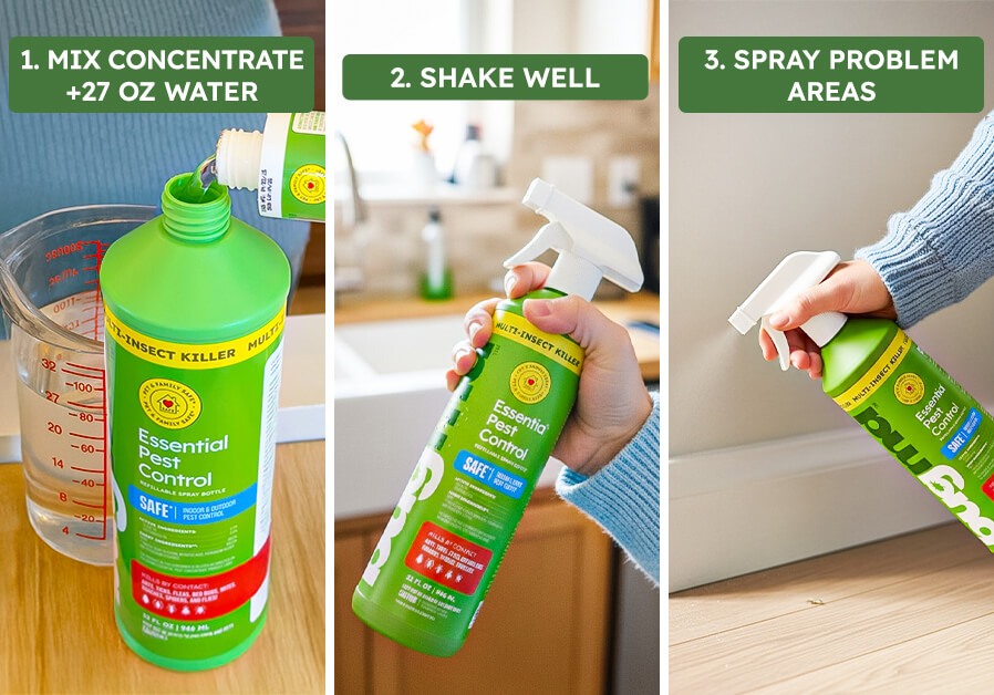 A: Most families find that 2-4 bottles are sufficient for treating an entire home, depending on severity and home size. Each concentrate bottle makes multiple full spray bottles of treatment solution.