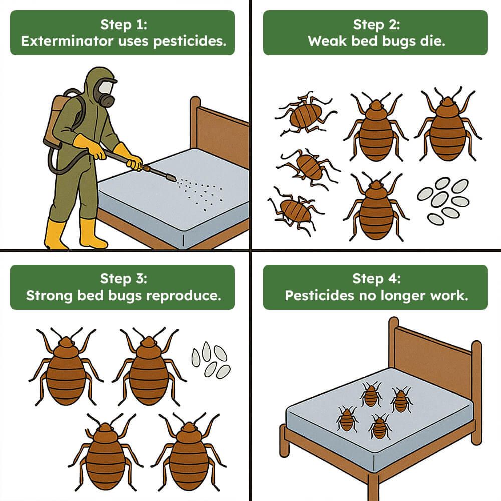 "Because 87% of bed bug populations in major cities are now resistant to multiple classes of pesticides. Including the pyrethroids that exterminators use."