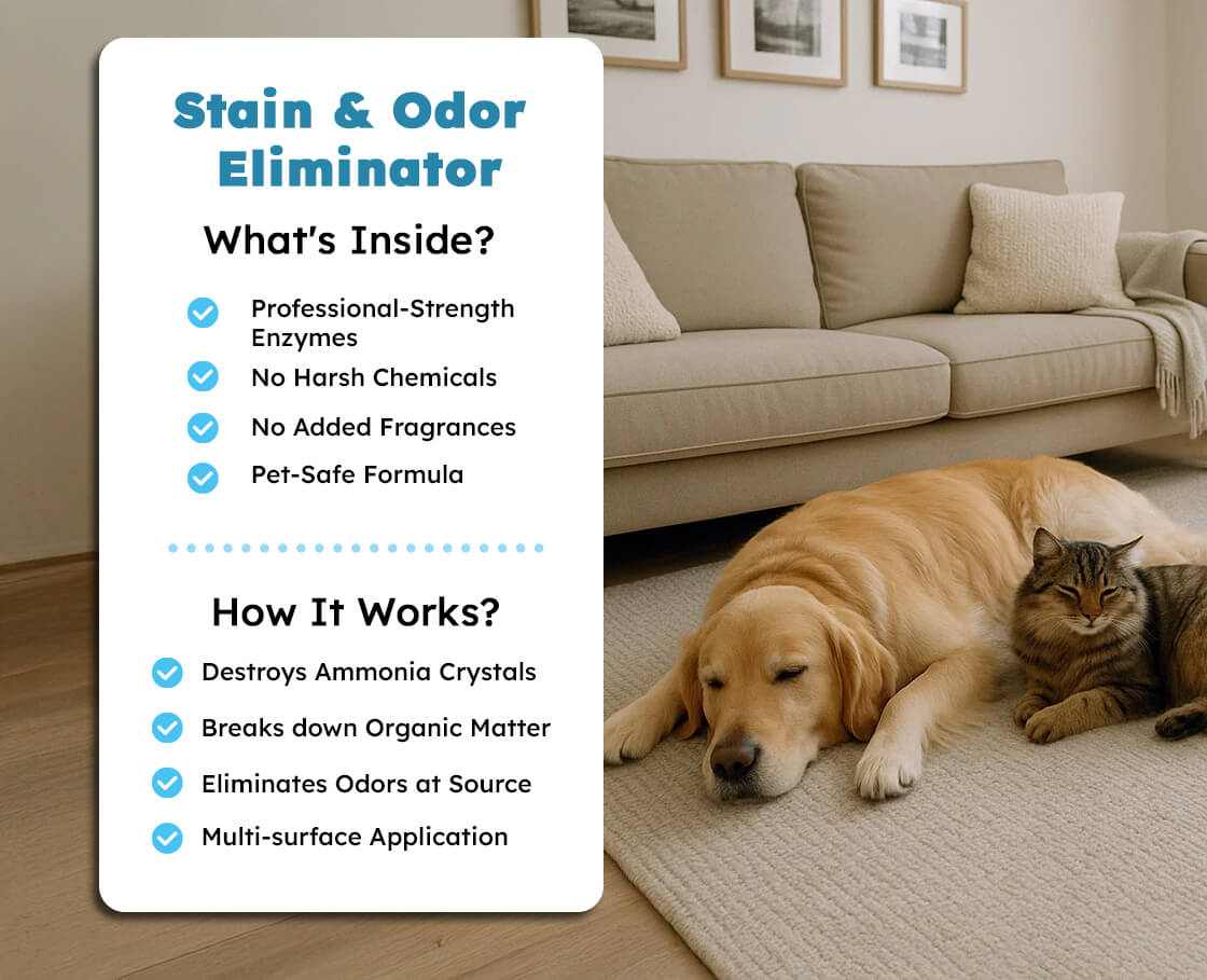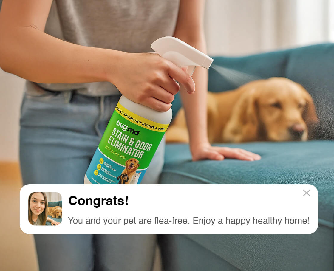 The complete system includes the Stain and Odor Eliminator that tackles the mess fleas create - from flea dirt stains on furniture to accident odors that happen when pets get stressed. Unlike treatments that only take care of fleas, our Stain and Odor Eliminator also handles the cleanup so your home gets back to normal faster.