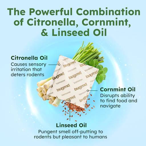 The potent blend of cornmint, citronella, and linseed essential oils send Rodents running.