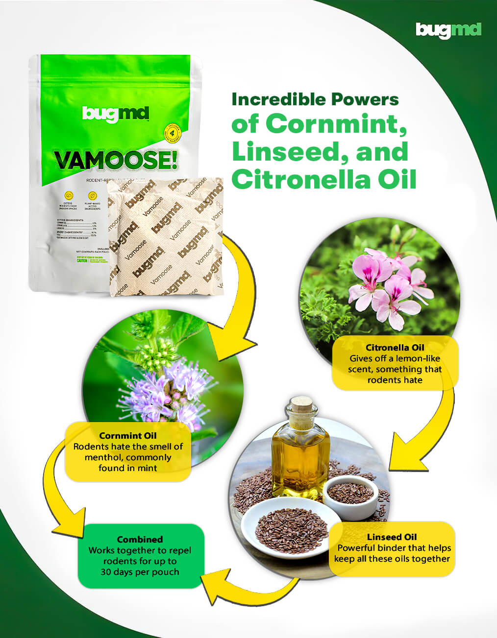 A lot of other pest control methods rely on harsh chemicals, but here at BugMD we found the three essential oils that will knock out most rodent problems with just one pouch: Cornmint oil, Citronella oil, and Linseed oil. Together they make an incredible team.